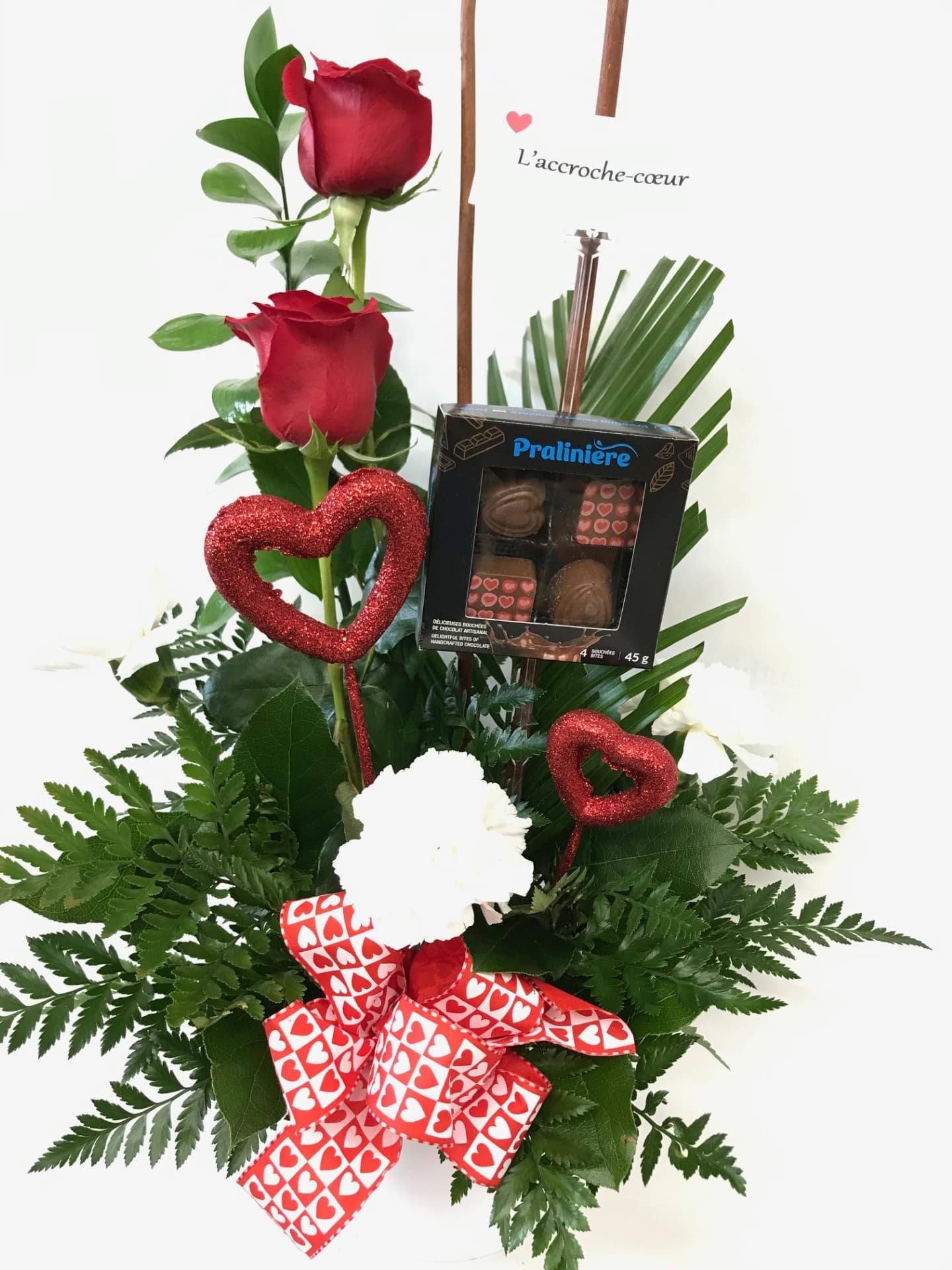 Arrangement linéaire composé de deux roses rouges, d’oeillets, de verdures et de décorations. Une boite contenant 4 chocolats de La Pralinière (Lac-Etchemin) est incorporée dans l’arrangement.. La couleur de la céramique (contenant) peut varier.
