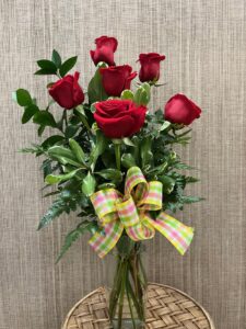 Un vase en verre contenant 6 roses rouges ou de couleur. Un ruban complète le tout.